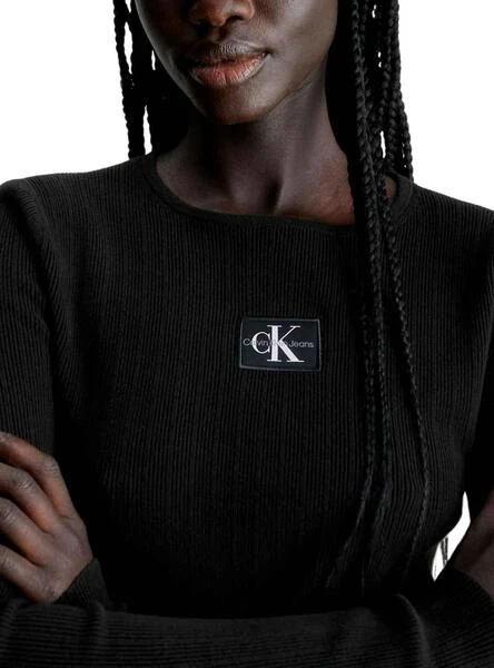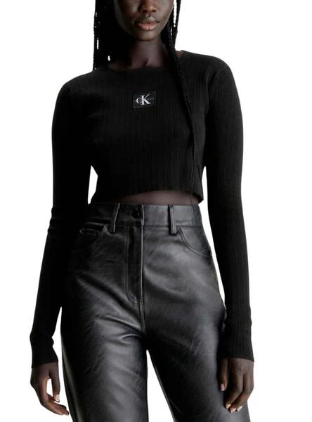 Top Calvin Klein Jeans. Modèle panaché Rib. Couleur noir. Col rond. Tissu côtelé. Logo brodé sur la poitrine. Manche longue. Coupe courte.