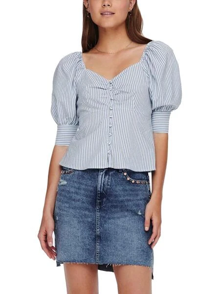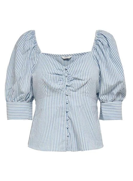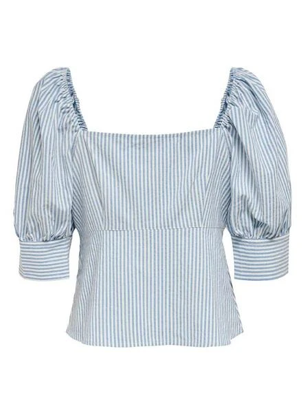 Top Only. Modèle Betti Life. Rayures estampillé. Coloris bleu et blanc. Manches bouffantes. Encolure carrée. Manche 2/4. Épaules avec élastique élastique. Le mannequin porte une taille S.