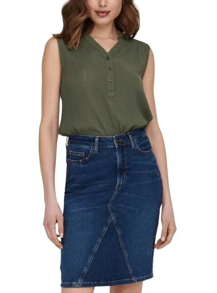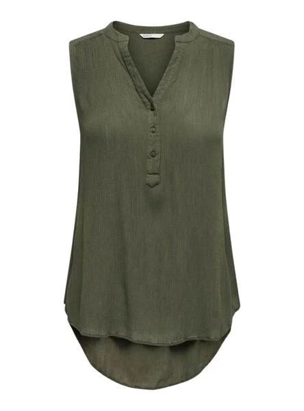 Top Only. Modèle Jette. Couleur verte. Col avec trois boutons. Sans manches. Décolleté en V. Dos plus long que l’avant. Tissu léger.