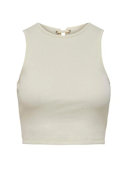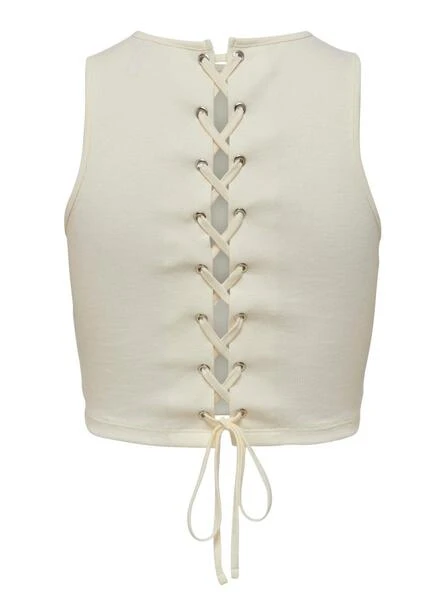 Top Only. Coupe courte avec détails. Couleur blanche. Dos croisé avec cordon de serrage. Manche à emmanchure. Col rond. élastique.