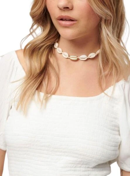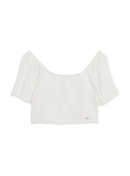Top Superdry. Modèle Off. Couleur blanche. Manches bouffantes. Encolure et dos ouverts. Coupe ajustée.
