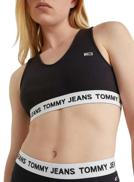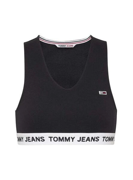 Top Tommy Jeans. Bande élastique en bas avec le logo de la marque. couleur noire. Décolleté en V. Petit drapeau sur le côté de la poitrine. Sans manches.