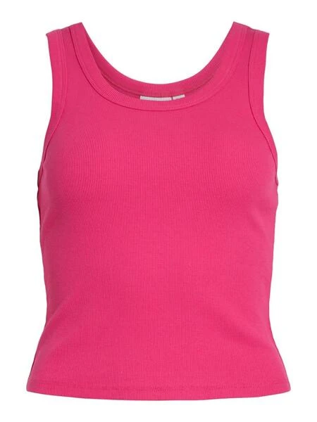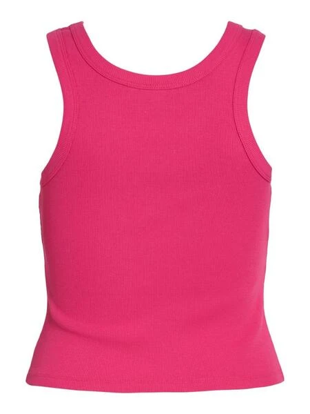 Top Vila. Modèle côte. Couleur rose. Col rond. Sans manches. Tissage élastique. coupe régulière.
