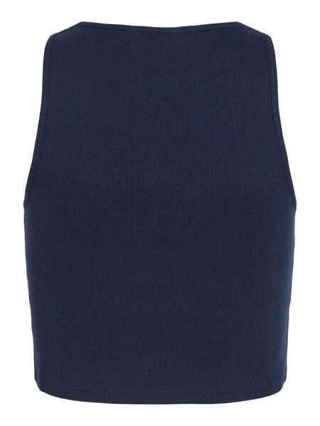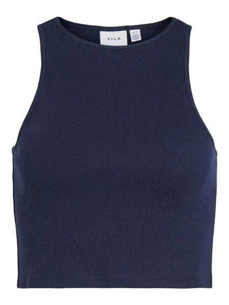 Top Vila. Modèle Félia. Couleur marine. Col rond. Tissu côtelé. Sans manches. Regular fit.