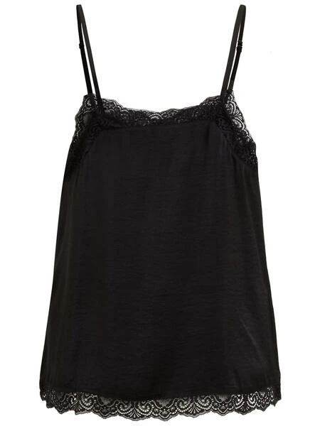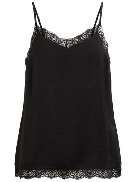 Top Vila. Modèle Vicava. Couleur noire. Col en V. Avec bretelles réglables. Avec de la dentelle à l’encolure et à l’ourlet. Tissu léger. Regular fit. Le mannequin porte une taille S.