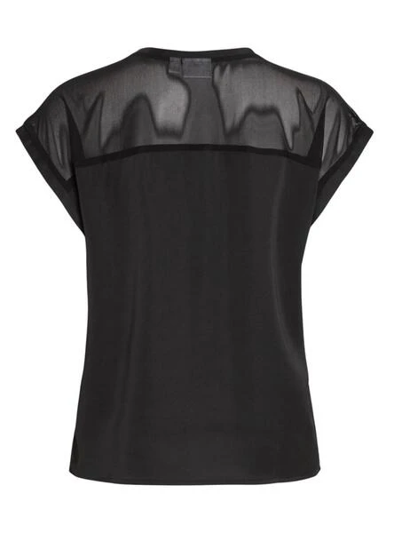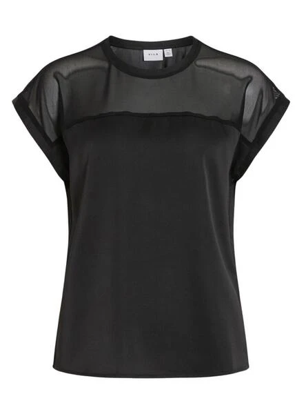 Top Vila. Modèle Villette. Couleur noire. Col rond. Manches courtes. Partie supérieure en maille transparente. Tissu satiné. Coupe régulière.